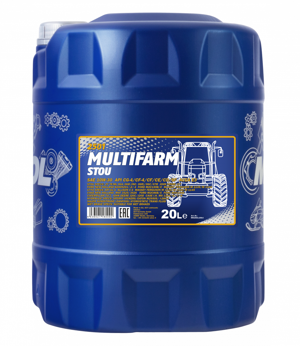 The use of agricultural equipment is characterised by a high dependency of the operation mode and weather conditions, the possibility of a round-the-clock operation, the remoteness from service centres, a wide range of additional attachments and, most commonly, a poor technical competence of the personnel. The use of MANNOL Multifarm STOU 10W-30 eliminates the risk of the equipment issues related to the oil use confusion, when the markings on the containers become illegible due to weather conditions when stored outdoors. The oil use facilitates accounting and storage. In the field, it is enough to take one canister and resolve the issue of adding oil into any piece of equipment in any situation.